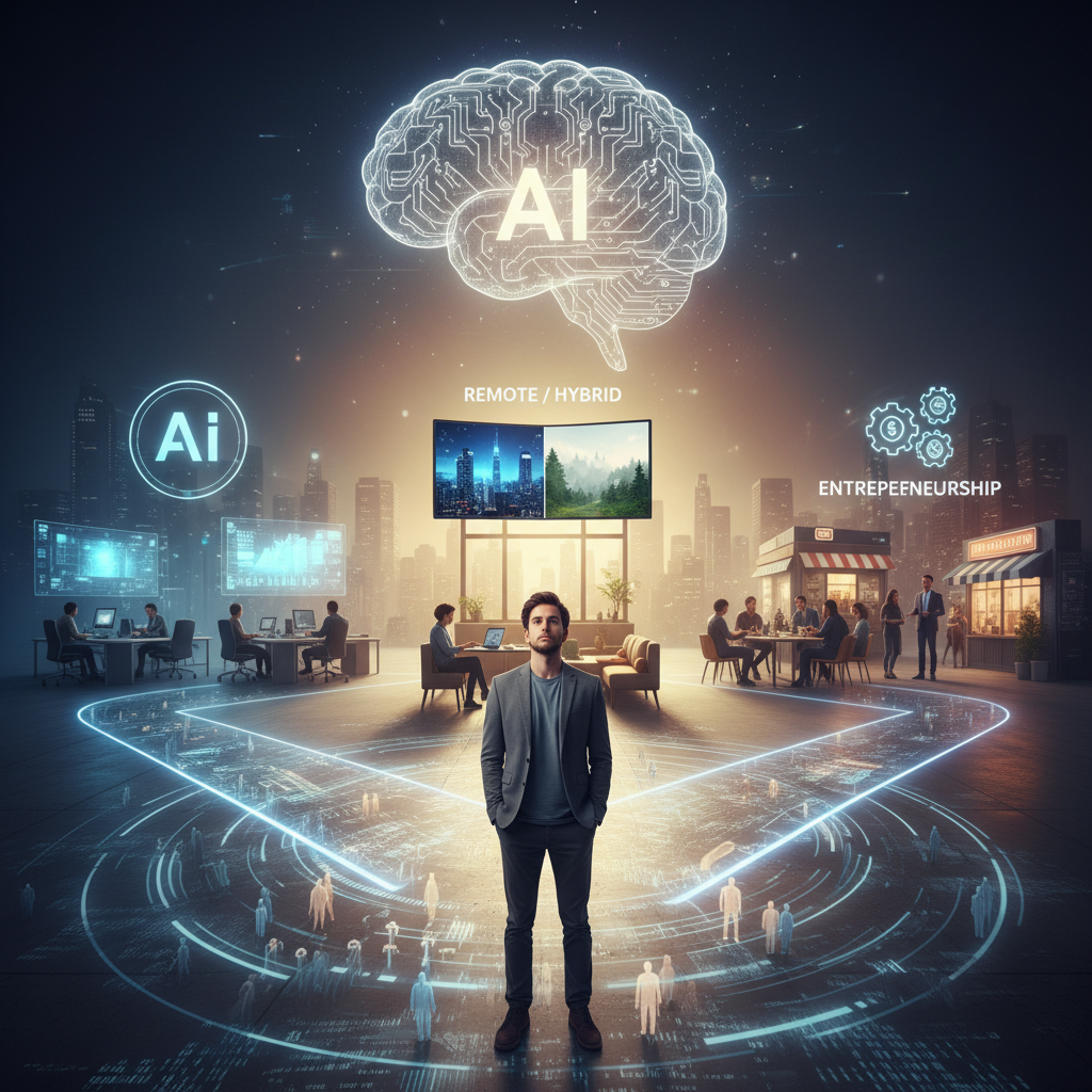 Alt: Office worker choosing future path at a crossroads with signs for AI, remote, hybrid, and entrepreneurship.