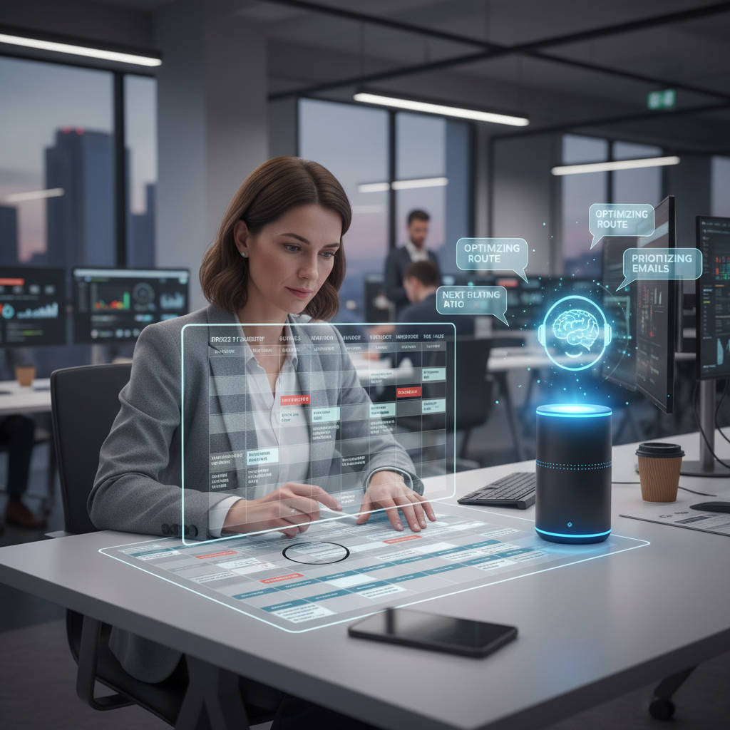 Alt: Busy office worker digital schedule with meetings and AI reminders on a screen.
