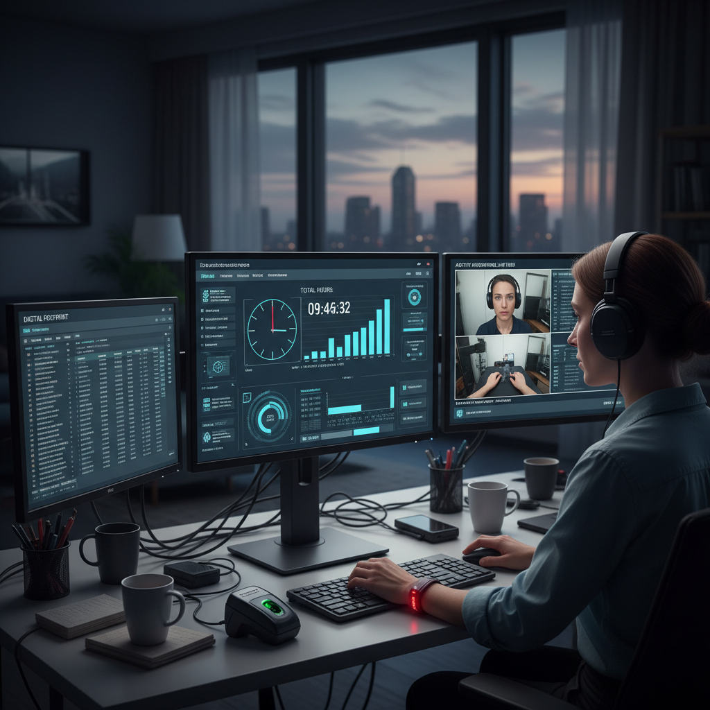 Alt: Remote office worker under digital surveillance with multiple screens and monitoring tools.
