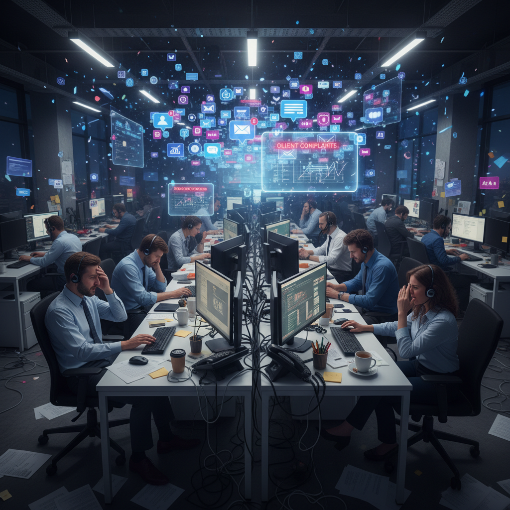Alt text: Stressed digital team in chaotic office overwhelmed by notifications and digital overload