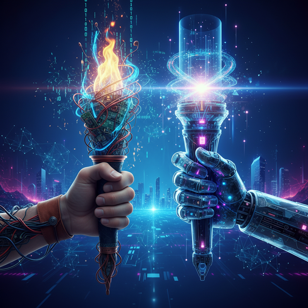 Alt text: Digital torch passed between human and AI hands, symbolizing transformation in online coordination