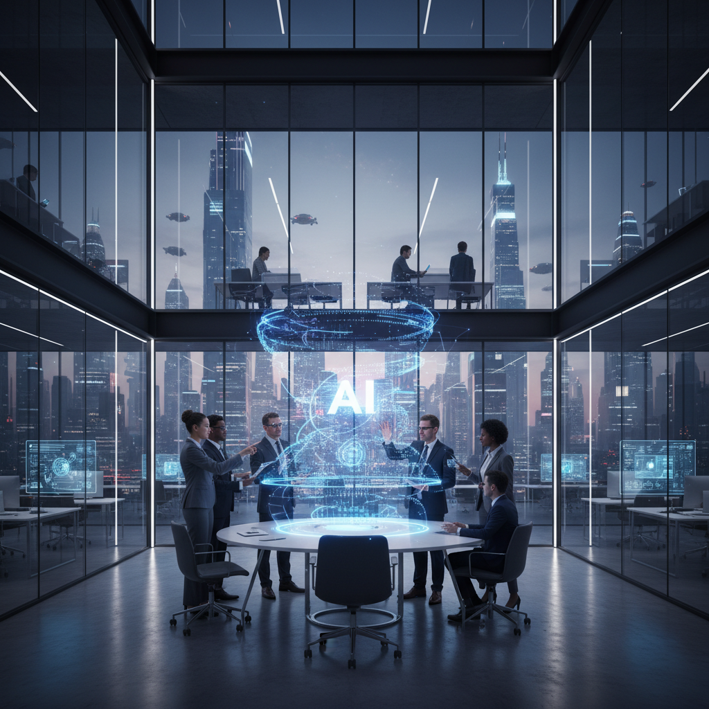 Alt text: In a cutting-edge glass office, a holographic AI teammate co-plans tasks with human colleagues in real time, representing the next stage of intelligent enterprise collaboration.