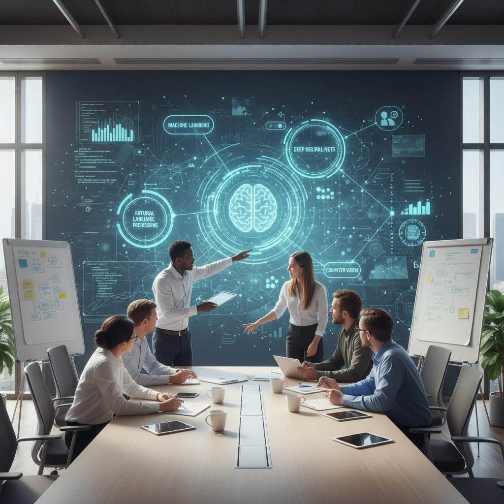 Alt text: A diverse team engages in a dynamic brainstorming session with an AI assistant projected on the wall, illustrating true synergy between digital and human intelligence in organizational work.