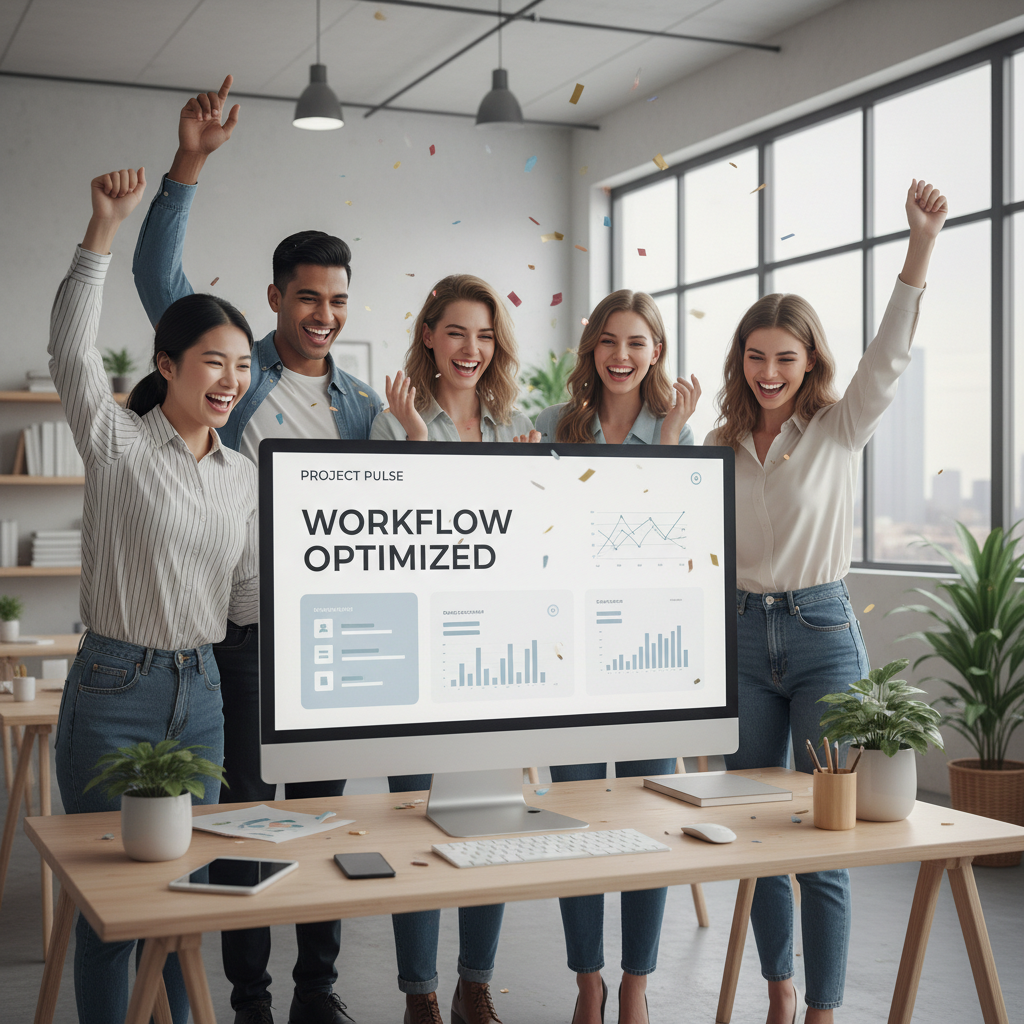 Alt text: A multicultural team high-fives in front of a clean digital dashboard showing organized projects, symbolizing the benefits of AI-powered organization for teams.