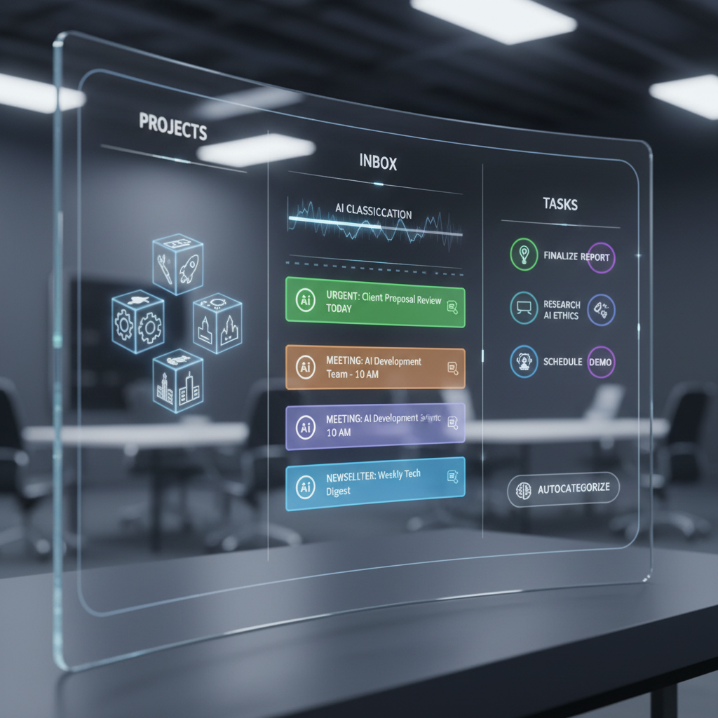 Alt text: A digital AI assistant interface visually sorts enterprise emails, tasks, and calendar streams into organized categories, representing the essence of AI-powered organization.