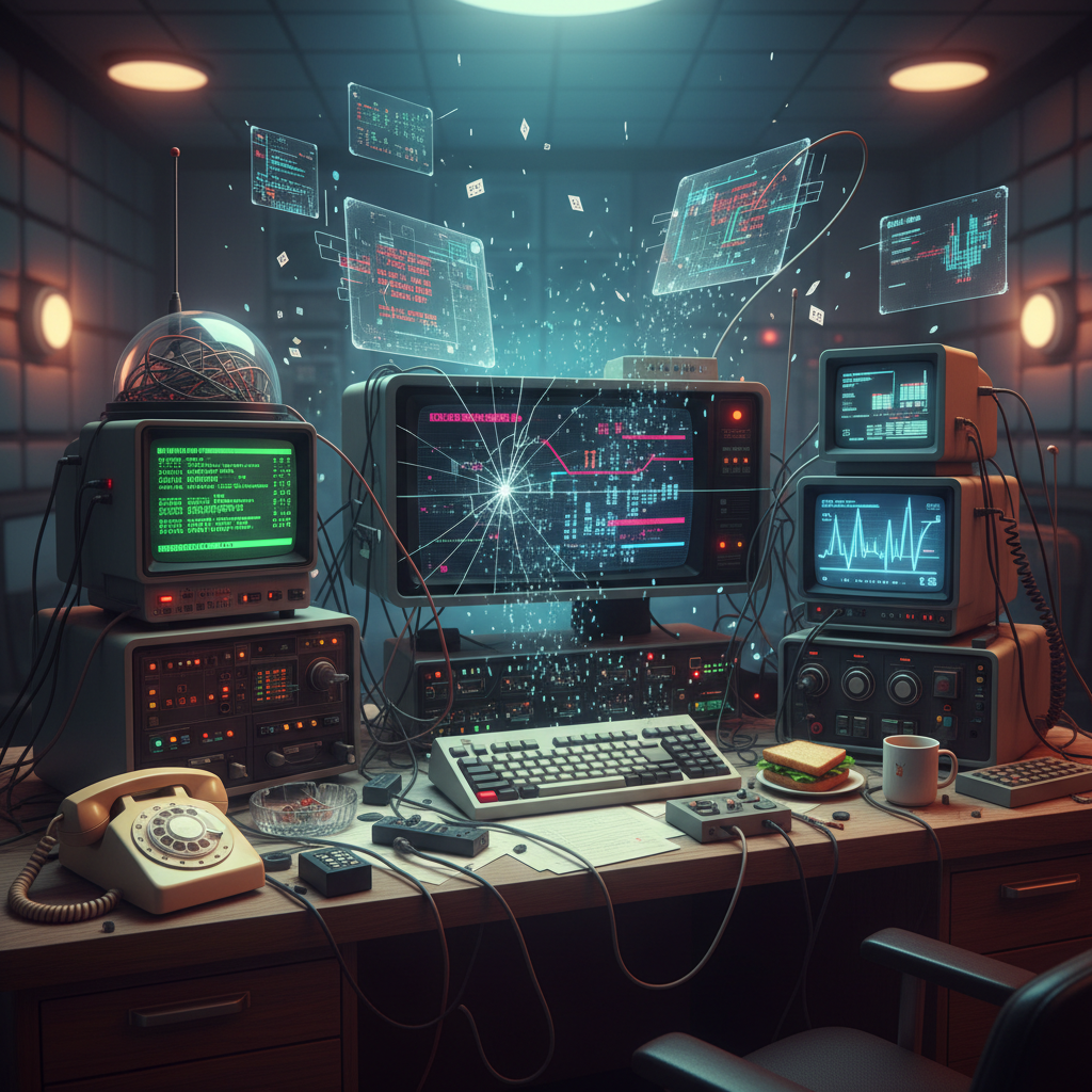 Alt text: A split image shows an organized 1980s office desk with paper planners next to a modern digital workspace overloaded with app notifications, highlighting the contrast between traditional and digital organizational tools.