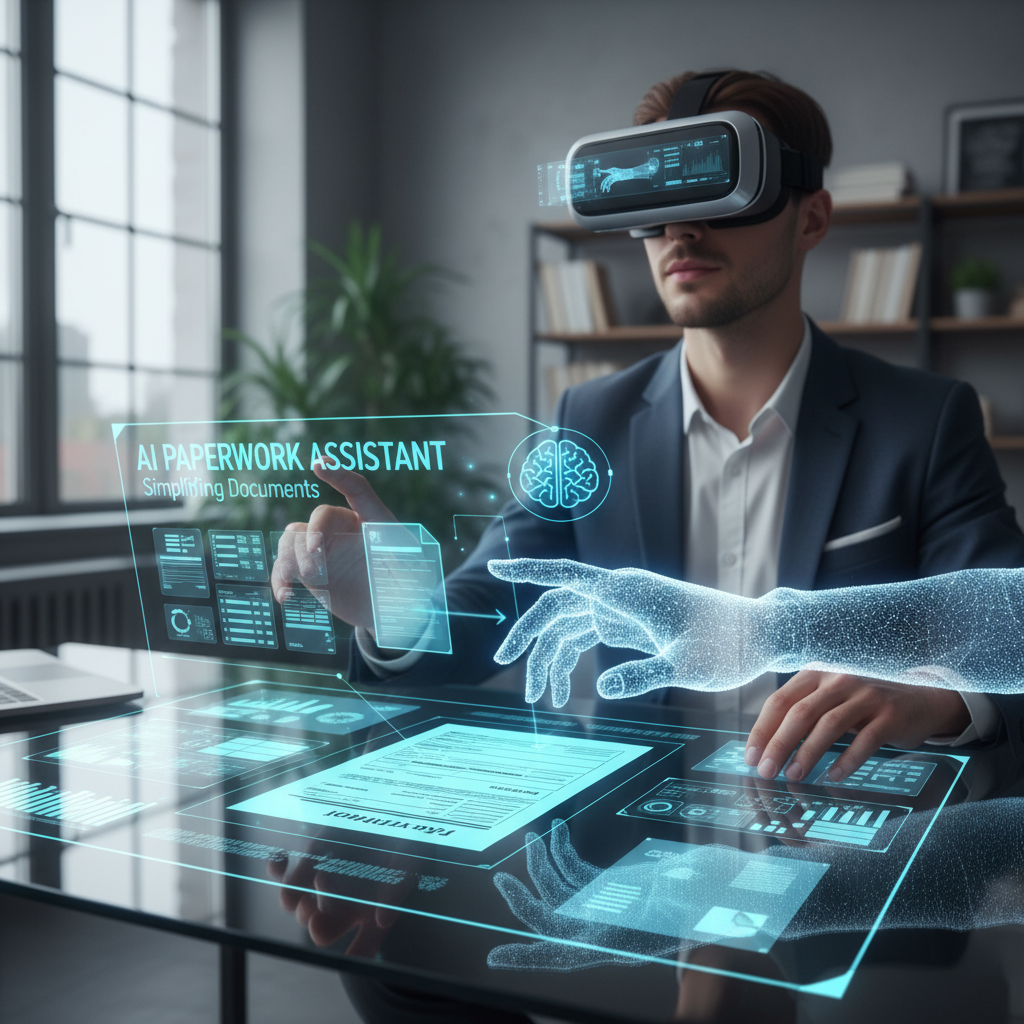 Alt: AI-powered paperwork helper automating document workflow, forms visible on desk and computer screen