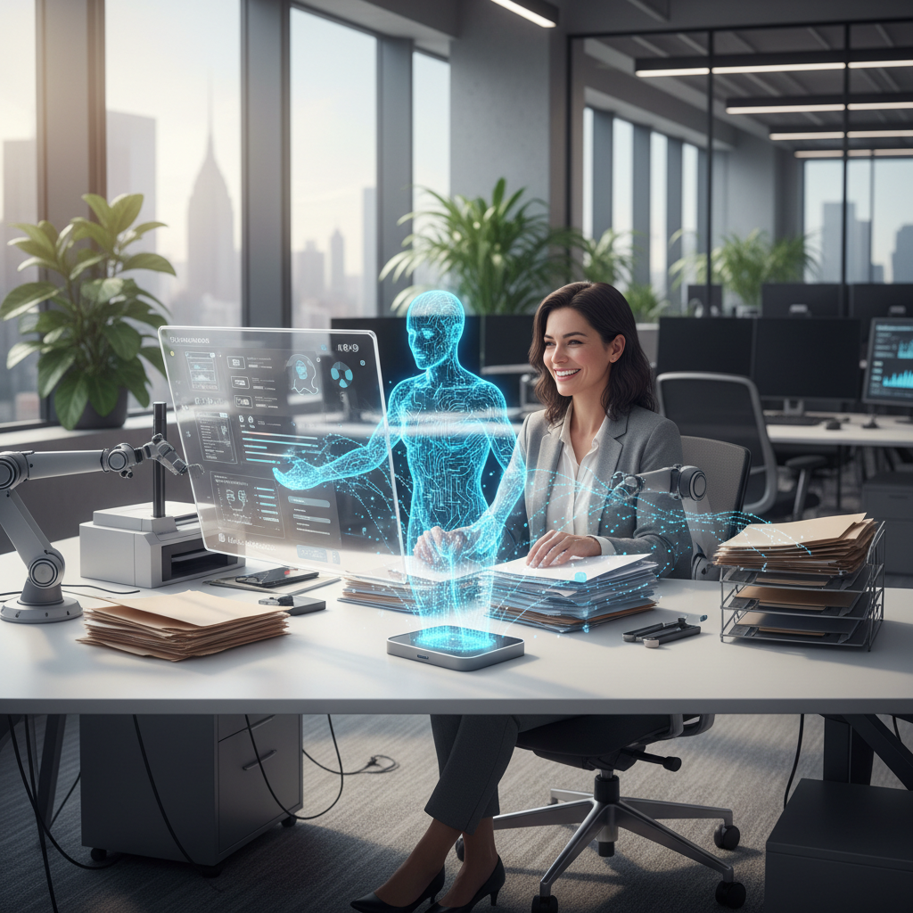 Alt: Paper-free workspace with digital paperwork helper glowing on screen