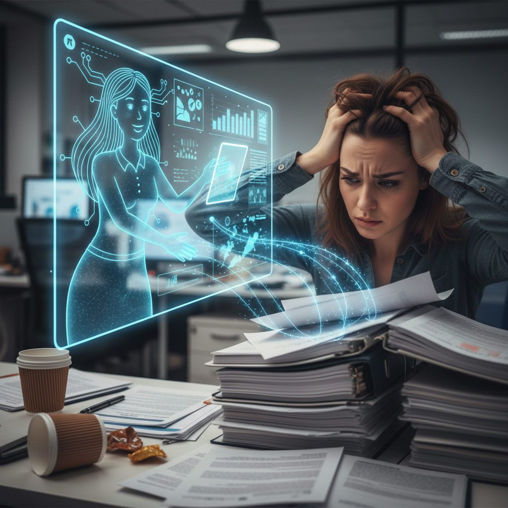Alt: Stressed office worker overwhelmed by paperwork, with digital paperwork helper offering assistance