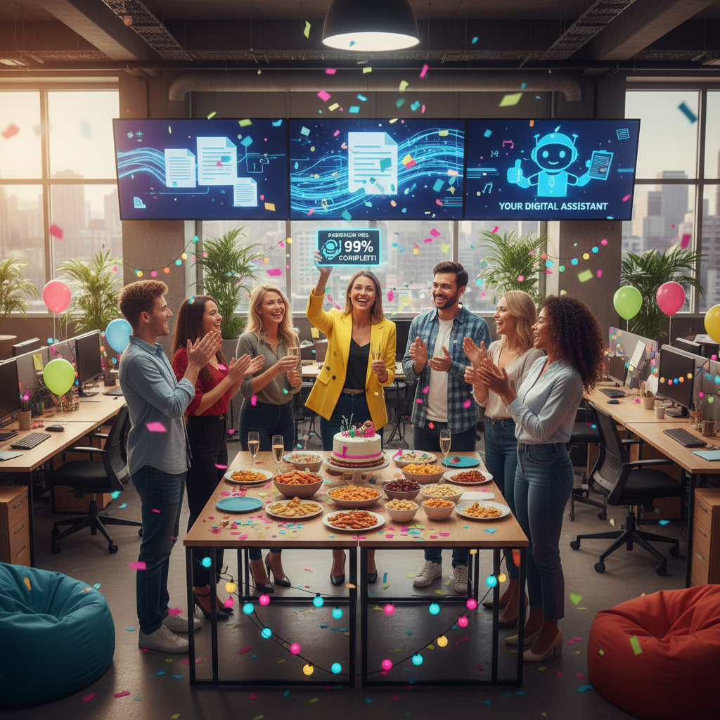 Alt: Team celebrating improved efficiency after implementing paperwork helper, digital assistant on monitor
