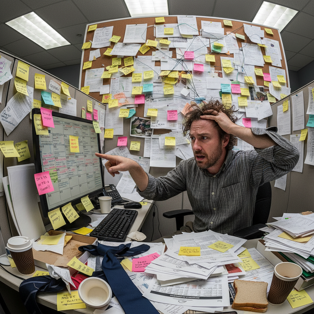 Alt text: Overwhelmed worker facing wall of chaotic schedules and sticky notes in cluttered office, planning schedules in disarray