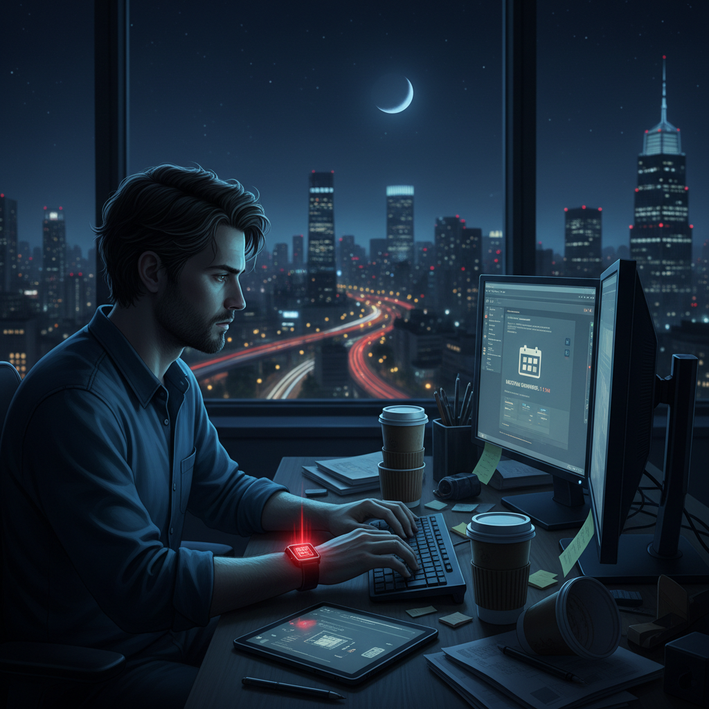 Alt text: Worker tuning out relentless digital reminders on smartwatch in nighttime city environment, highlighting scheduling overload