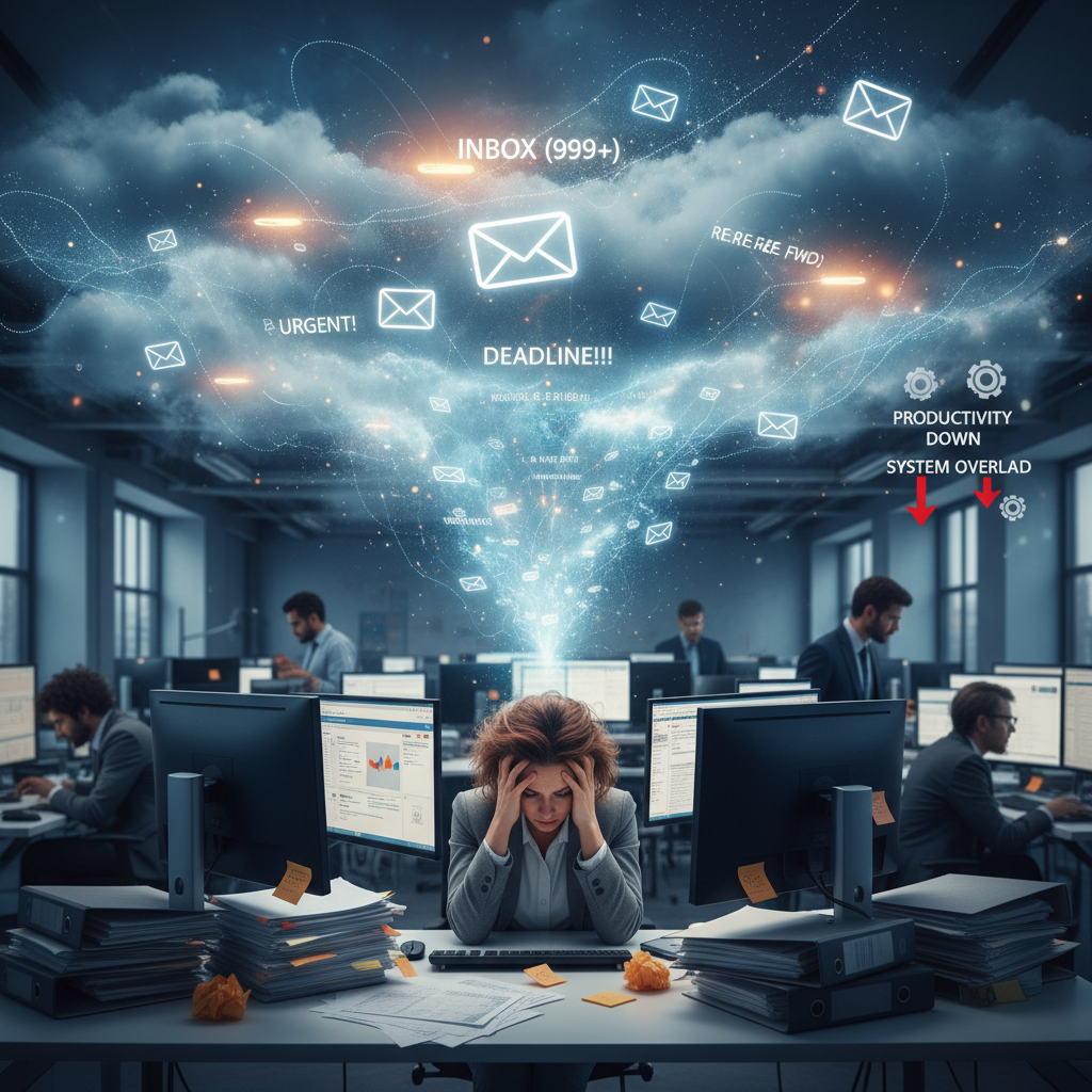 Alt text: Worker overwhelmed by digital chaos symbolizing email overload and workflow breakdown in enterprise productivity.