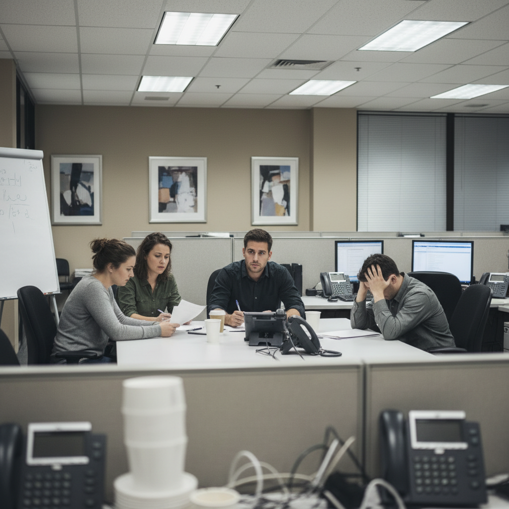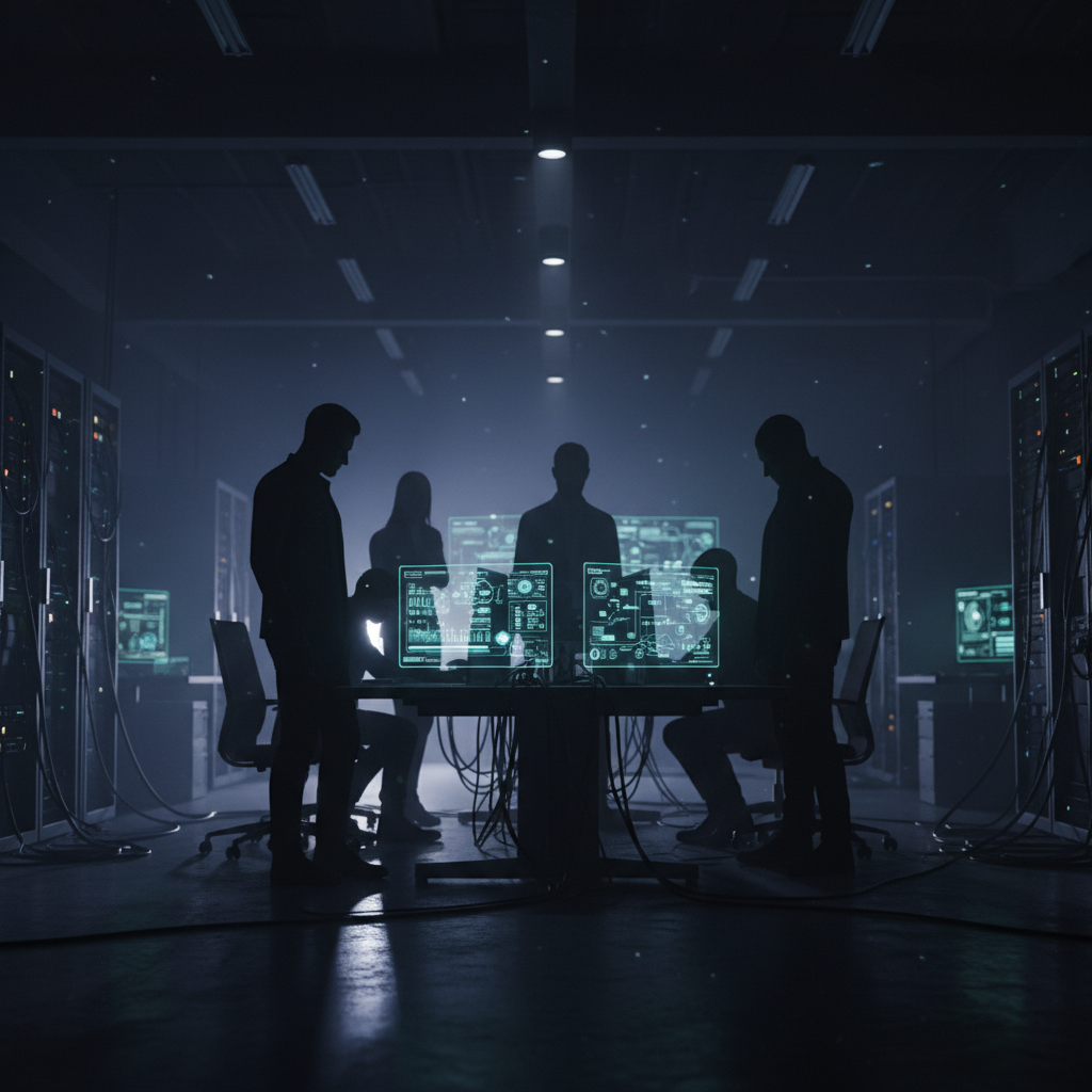 Shadowy figures representing invisible workflows in a dimly lit office, highlighting hidden process workflow risks.