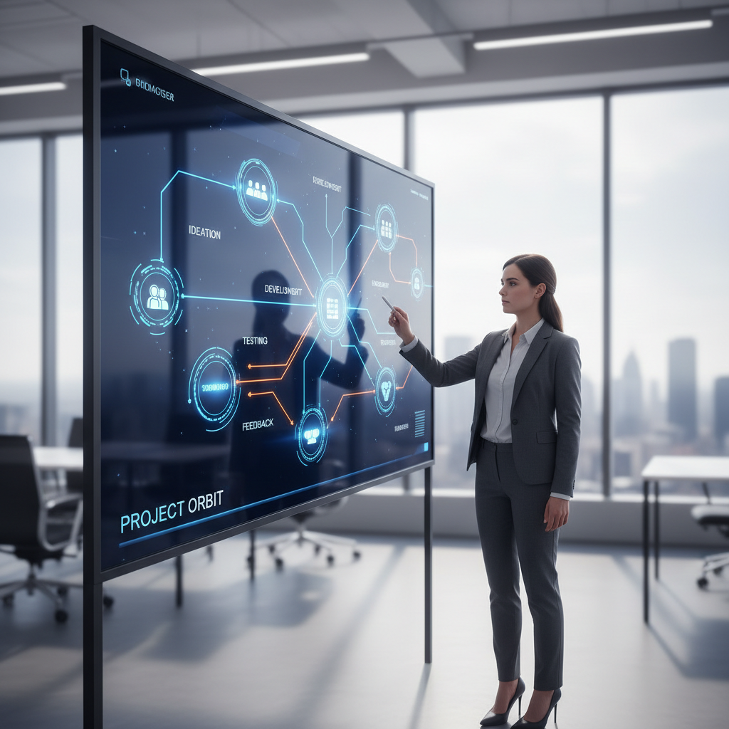 A project manager mapping an enterprise workflow on a digital whiteboard, illustrating clear touchpoints and structure.