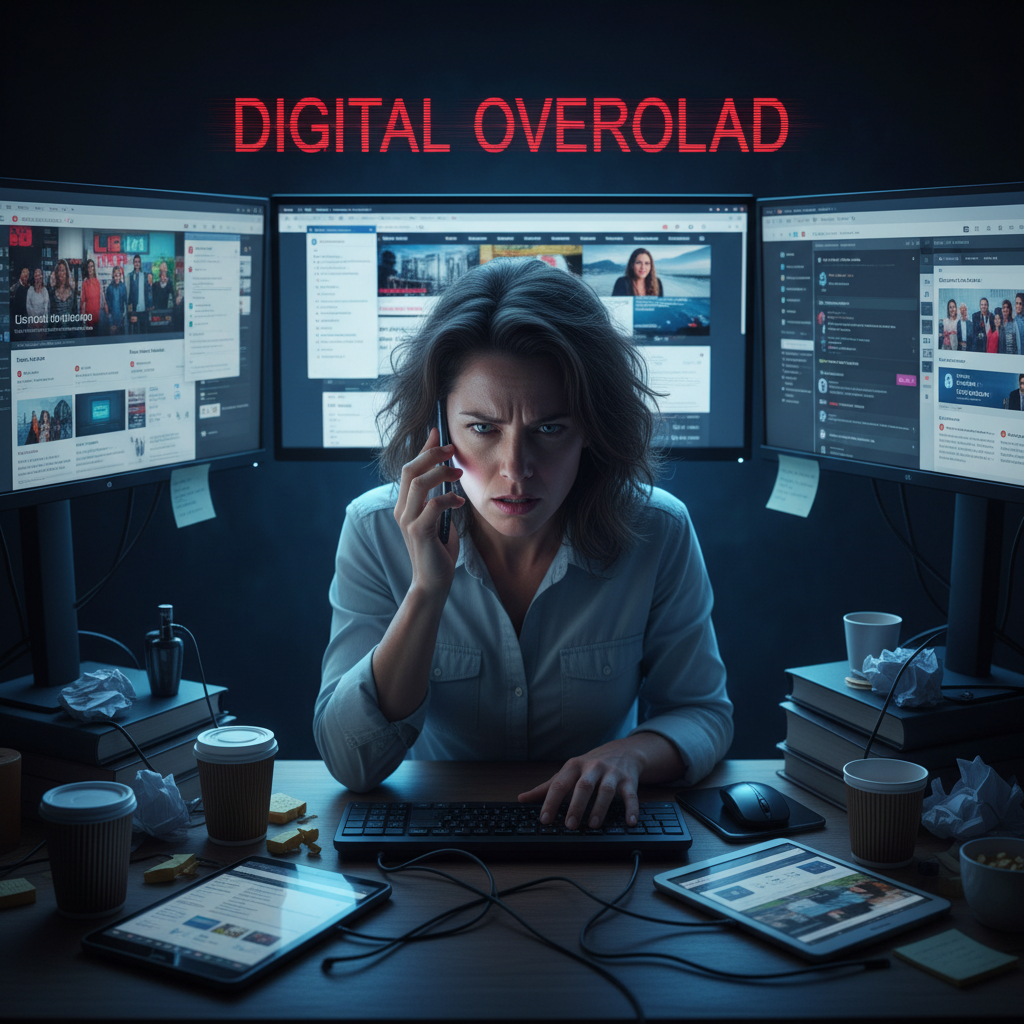 An employee swamped by digital communications and AI bots, demonstrating the risks of tech overload in professional workplaces.