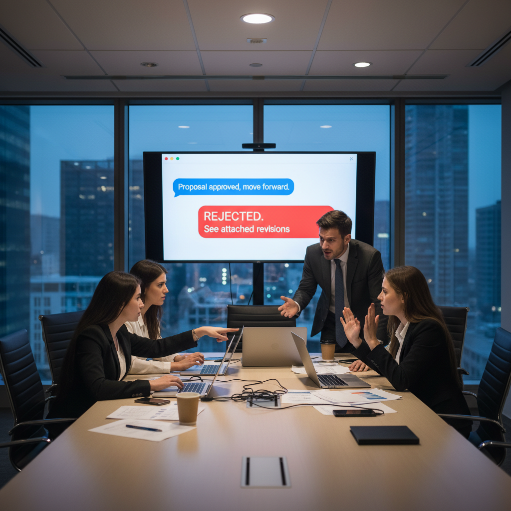 Modern team members in a heated discussion about workplace miscommunication, highlighting the cost of unclear professional communication.