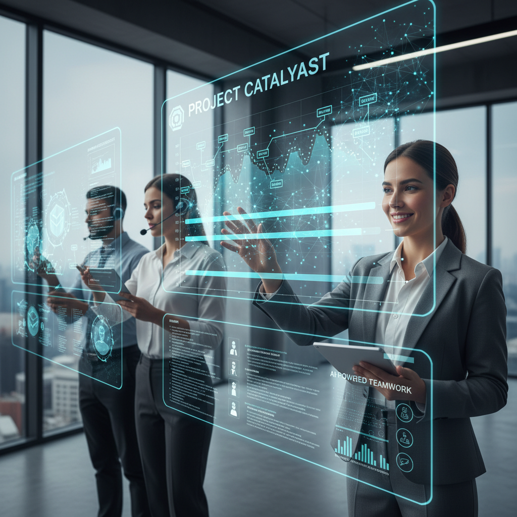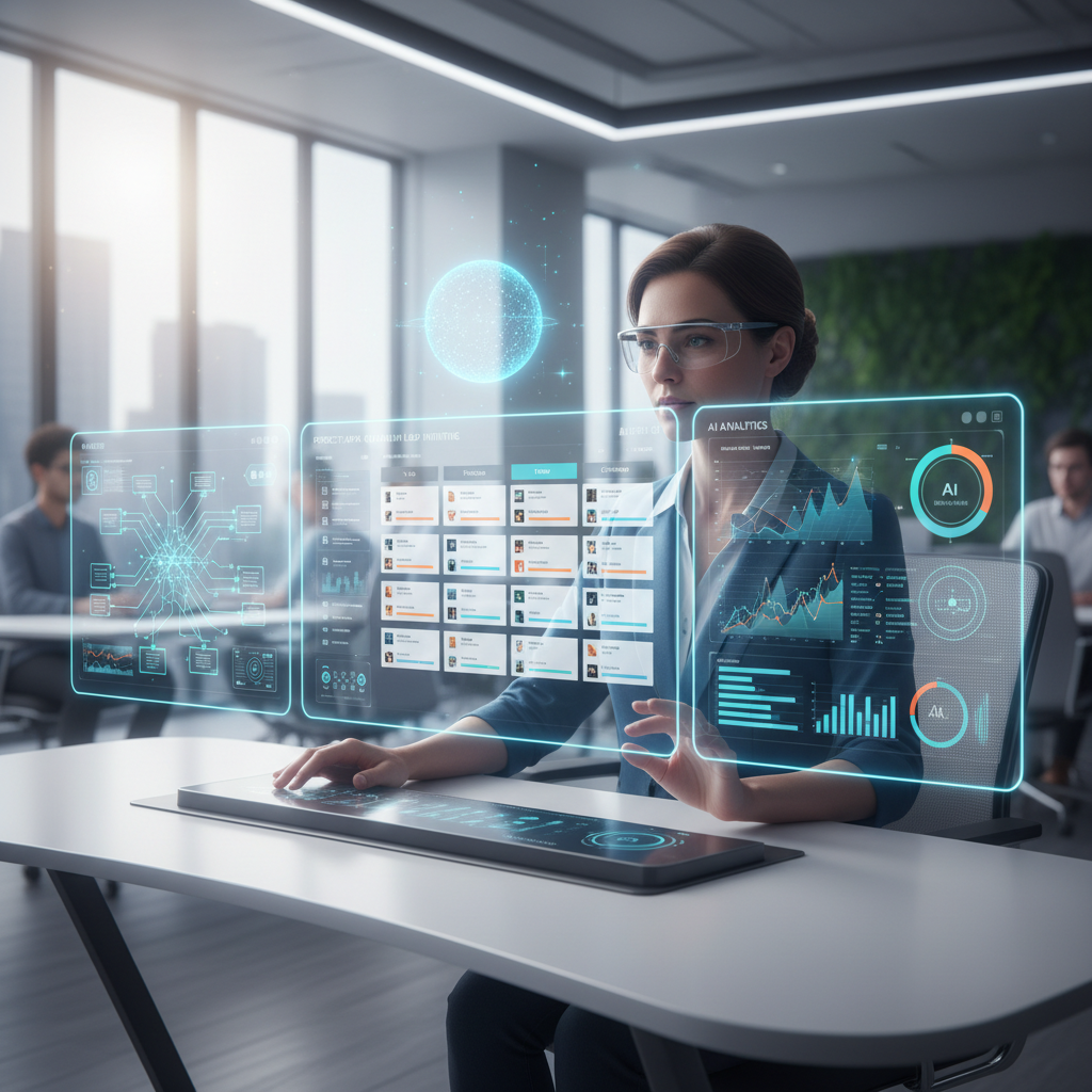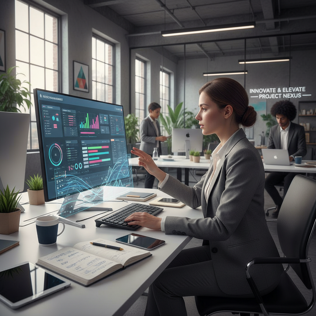 Alt text: Project administrator standing confidently in a modern office, digital project boards and AI interfaces in background, showcasing teamwork and task management.