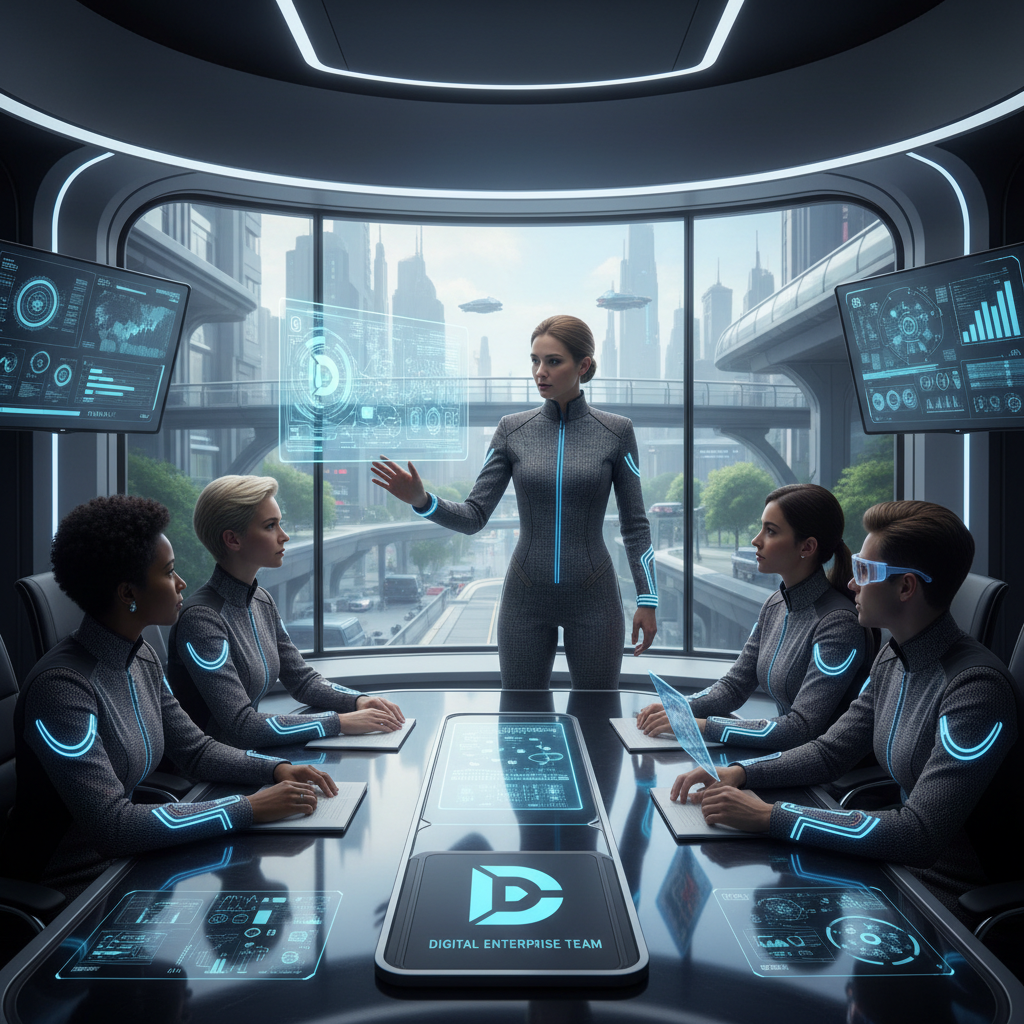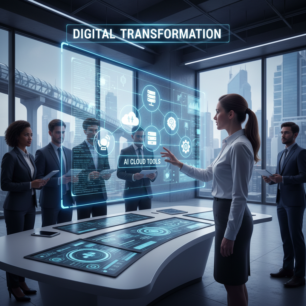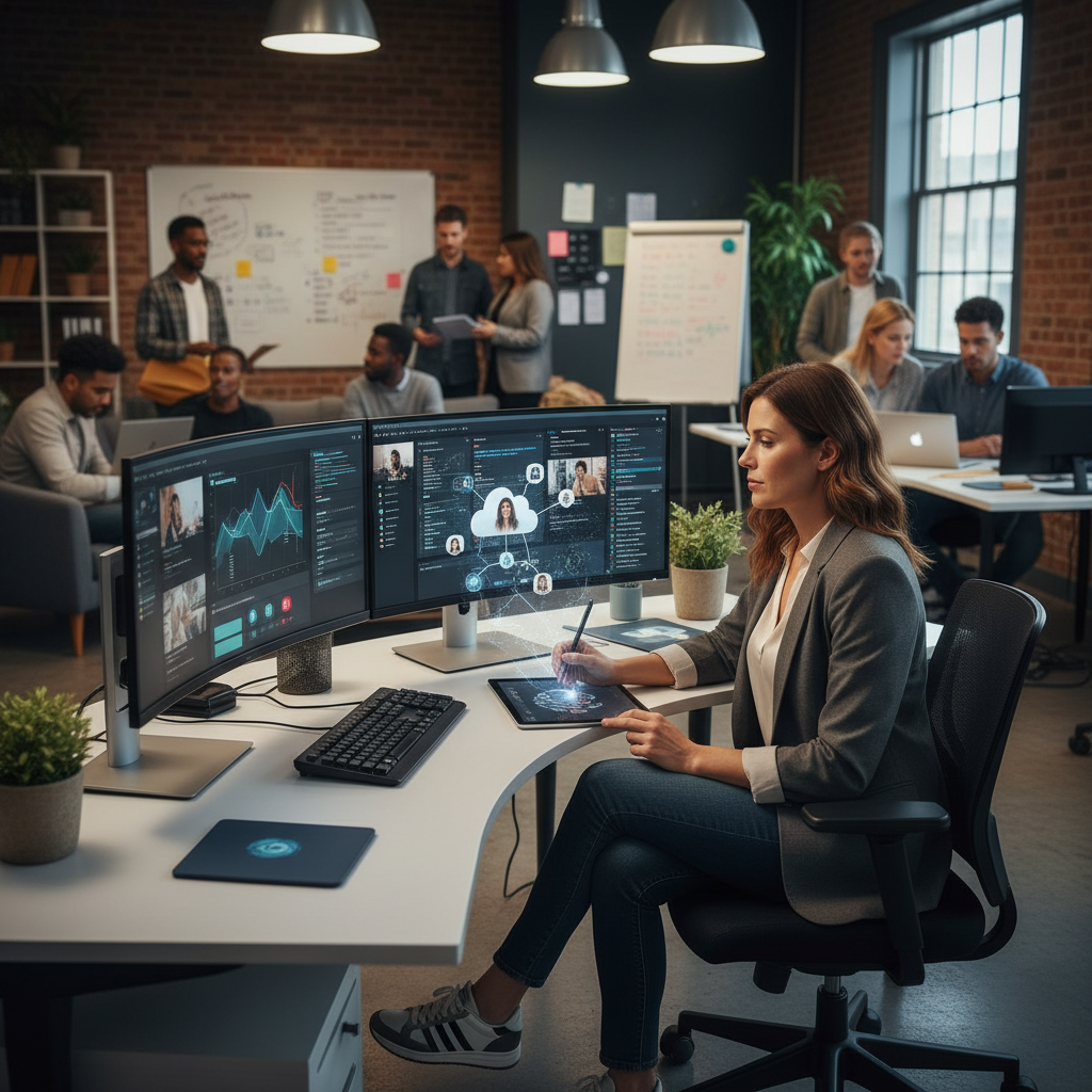 Alt text: Project administrator adapting to digital transformation, working with AI and cloud-based tools in a collaborative workspace.