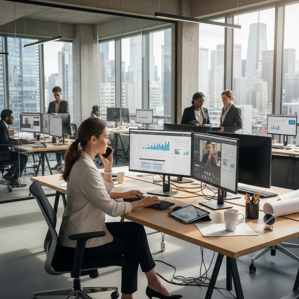 Alt text: Project administrator multitasking in a fast-paced urban office, handling emails, calls, and digital dashboards with focus and resilience.