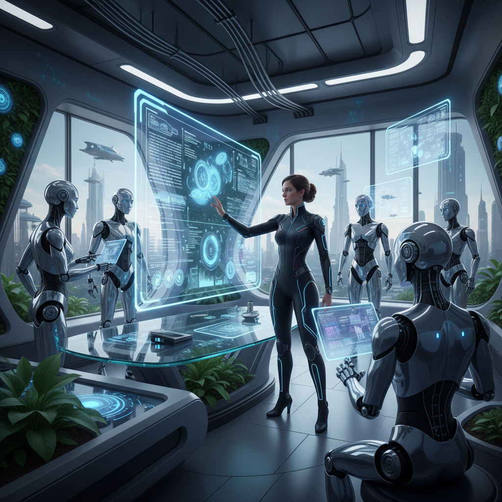 Alt text: AI and human project administrators collaborating in a modern office, symbolizing the balance between automation and human expertise.