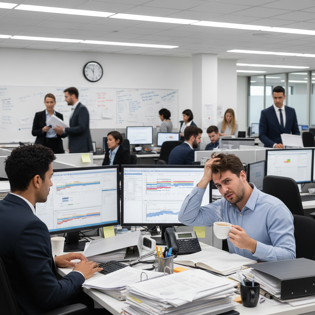 Alt text: Project administrator under stress in a busy office environment, reflecting the often unseen pressures of the role.