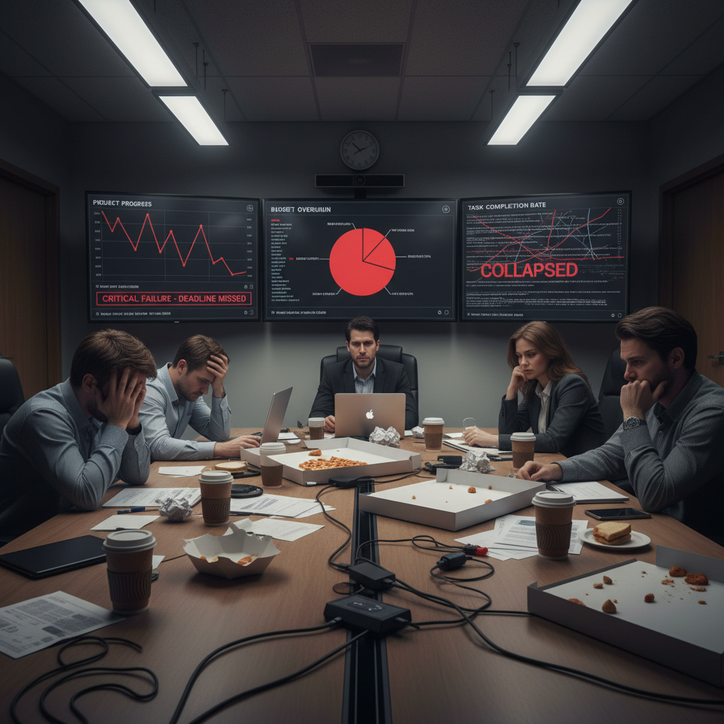 Kickoff to disaster spanned just six months. First, manual reporting bogged down every decision. Next, “shared ownership” meant no one truly owned delivery. Hidden work multiplied; deadlines slipped in silence. By month four, 30% of the project budget was burned in status meetings and firefighting. In the end, the product limped out the door—late, over budget, and missing half its promised features.