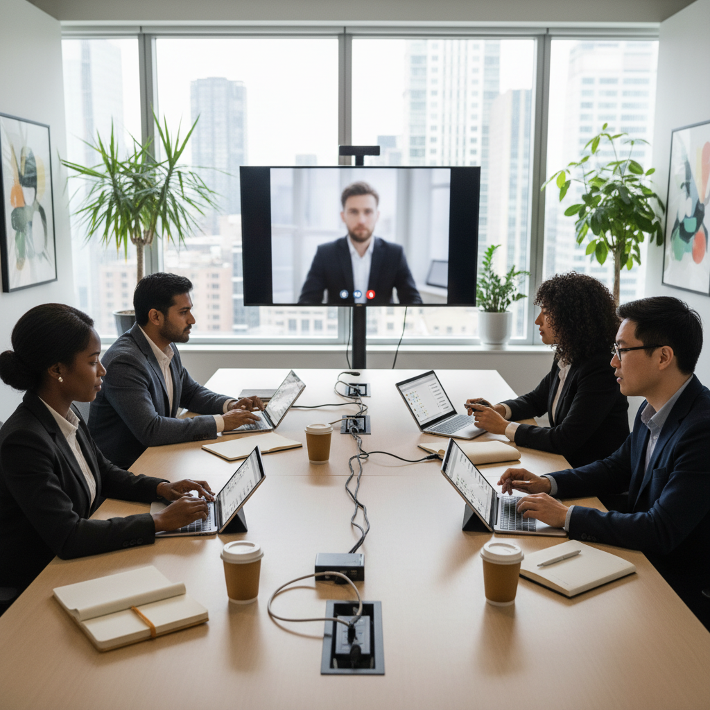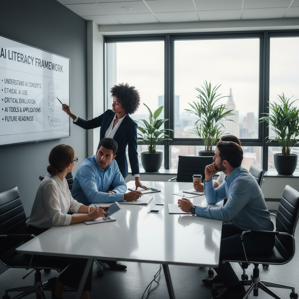 Alt text: Professional using AI-powered productivity tools in a collaborative team meeting, highlighting AI-literacy among qualified staff.