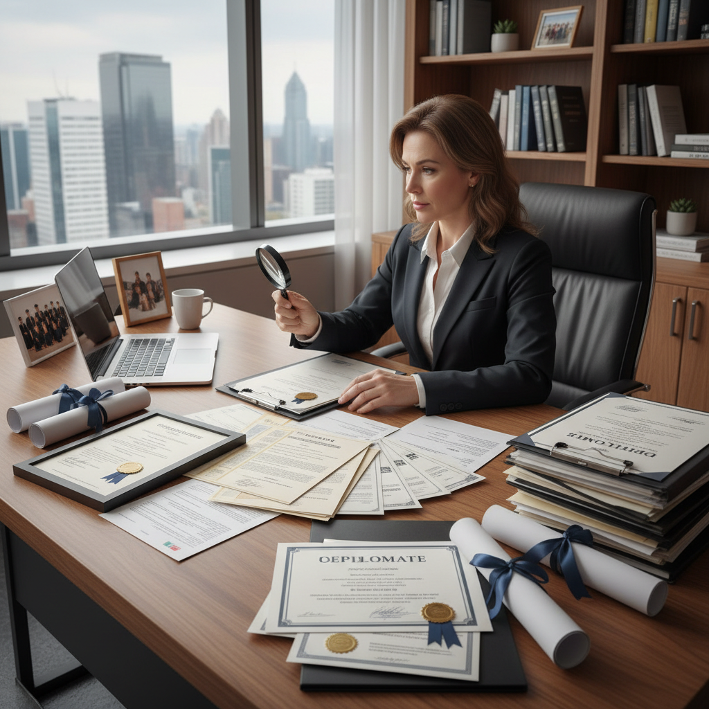 Alt text: Pile of diplomas and certificates on a hiring manager’s desk, symbolizing qualification inflation.