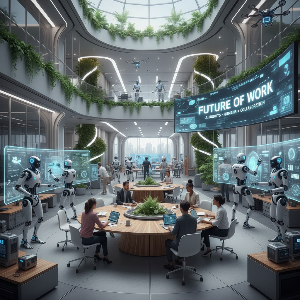 Alt text: Modern open office with AI-powered robots and humans collaborating, symbolizing the future of work and qualified staff.