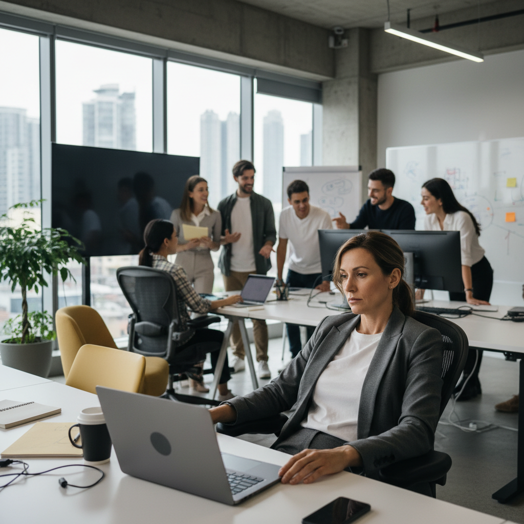 Alt text: Disengaged employee sitting apart from team in modern office, representing underperformance due to overqualification.