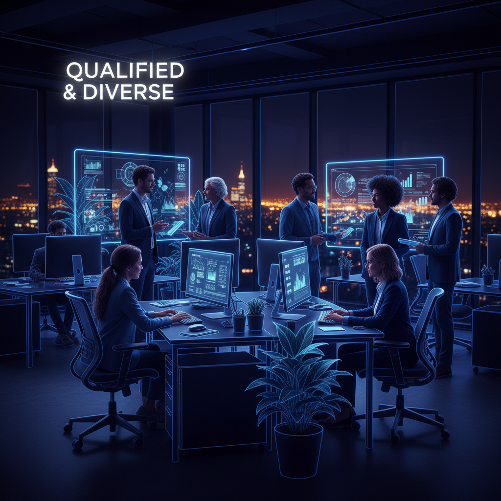 Alt text: Diverse team working in a modern office, one member with a glowing outline symbolizing truly qualified staff.