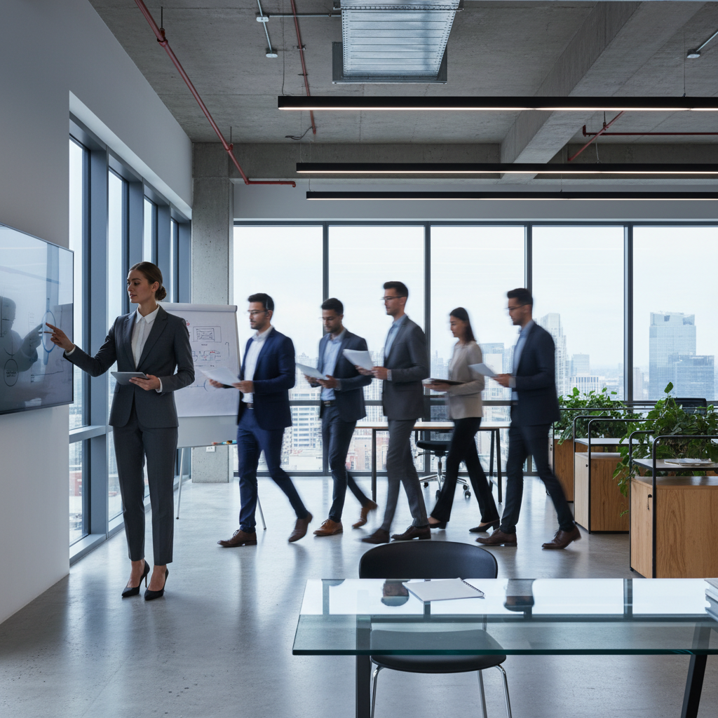Visionary leader presenting to a creative team with a reliable professional by their side, balancing creativity and trust.