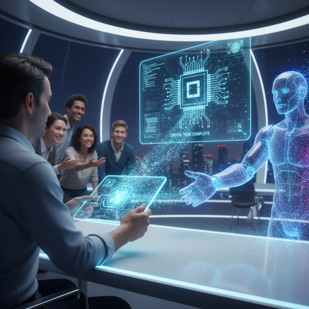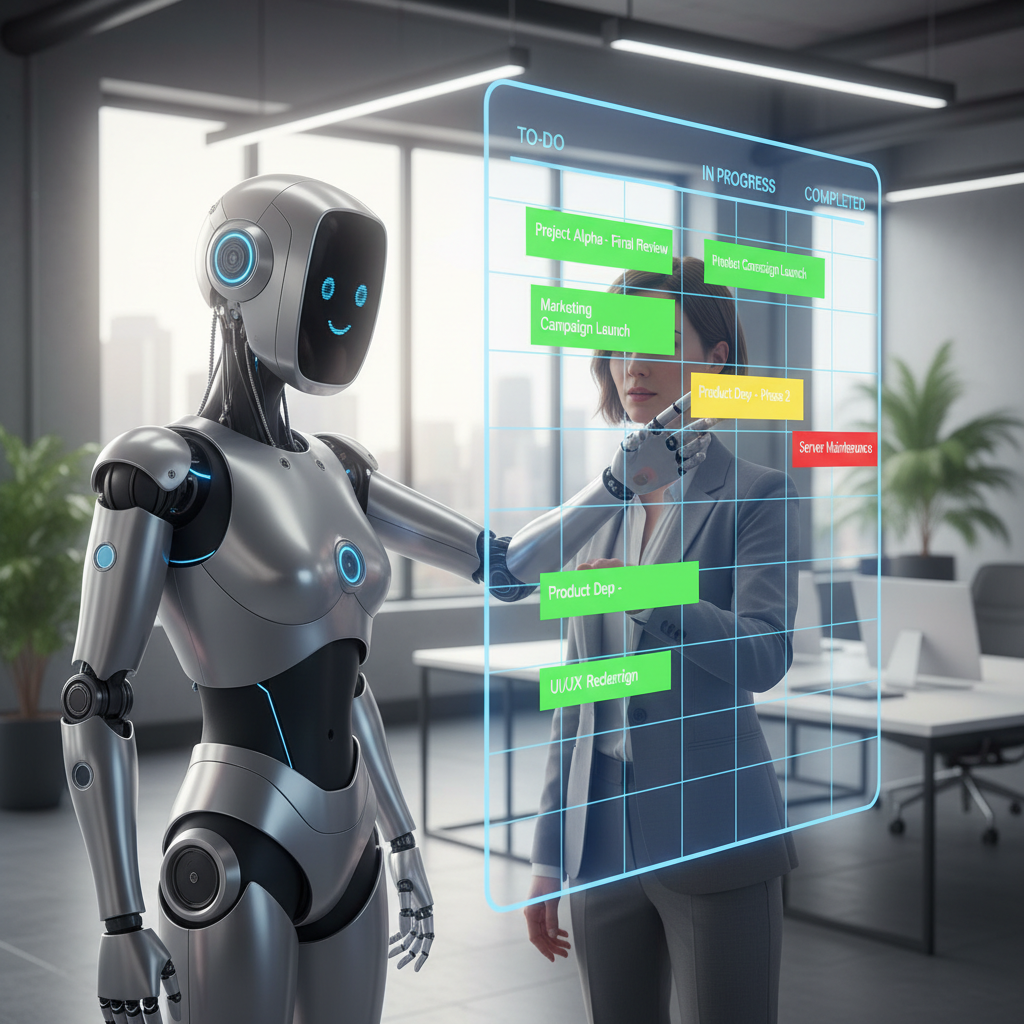 Alt text: AI coworker and human manager sharing virtual task board, depicting collaboration with digital tools.