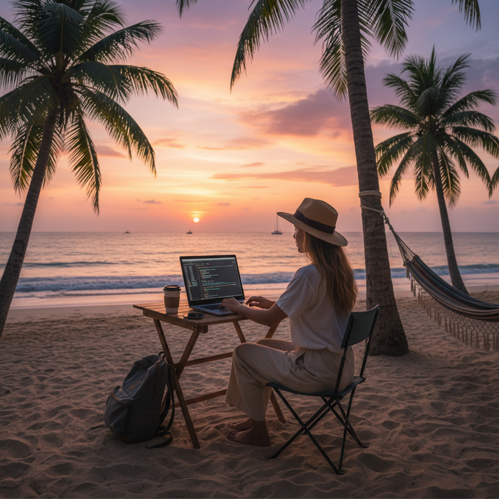 Alt text: Digital nomad working remotely, blending life and work, symbolizing global talent and remote management.