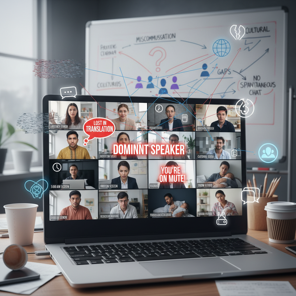 Alt text: Remote team video call with mixed engagement, culture challenges, illustrating digital collaboration difficulties.