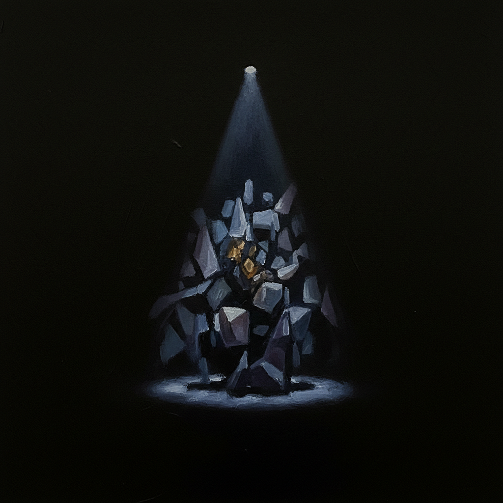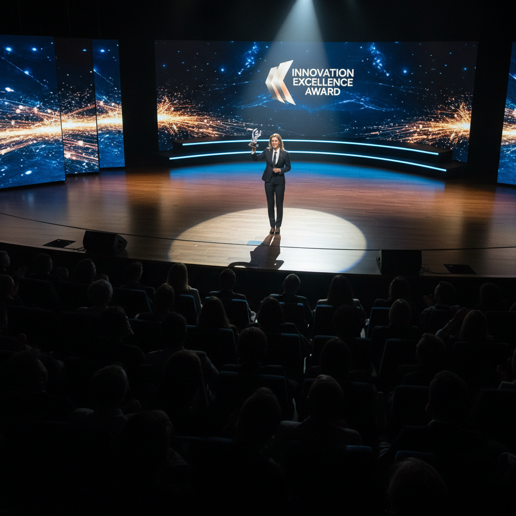 Alt text: Researcher receives award in modern auditorium, spotlight and shadows highlight triumph and isolation, depicting research specialization fame.