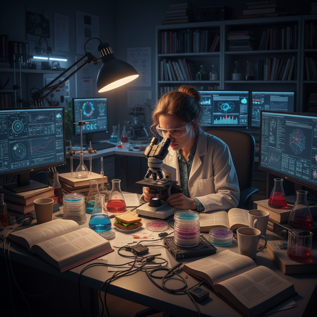 Alt text: Cinematic photo of a researcher at a cluttered workstation with diverse research tools, illustrating research specialization and innovation.