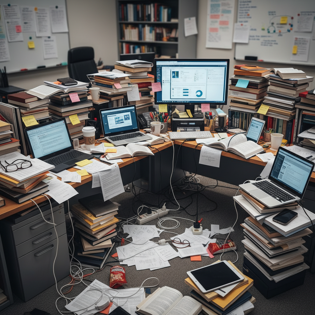 Alt text: Overwhelmed workspace representing unsupported research, highlighting research support challenges and inefficiency