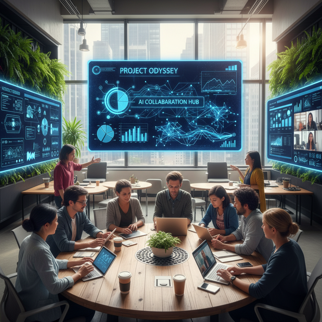 Alt text: Wide-angle, high-energy photo of a diverse enterprise team working together with digital collaboration tools and AI displays in the background.