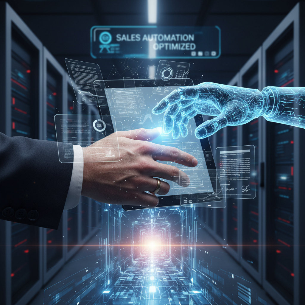 Alt text: Symbolic photo of a human hand shaking a holographic AI hand over sales documents, representing hybrid work between AI tools and sales secretaries.