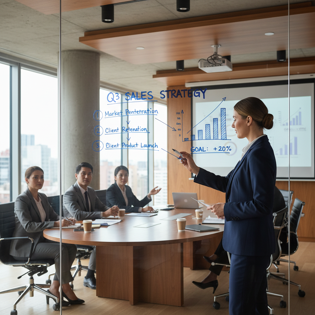 Alt text: Edgy, narrative photo of a sales secretary leading a sales strategy session at a glass board, collaborating with executives in a contemporary office.