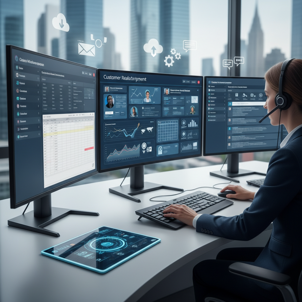 Alt text: High-contrast photo of a sales secretary at a desk with multiple screens, confidently using CRM and email automation tools, highlighting digital expertise.