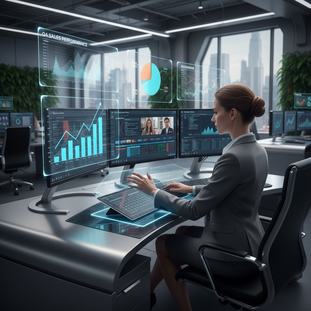 Alt text: Photo of a sales secretary multitasking across multiple screens with visible data charts, showing digital and analytical skills in a modern office.
