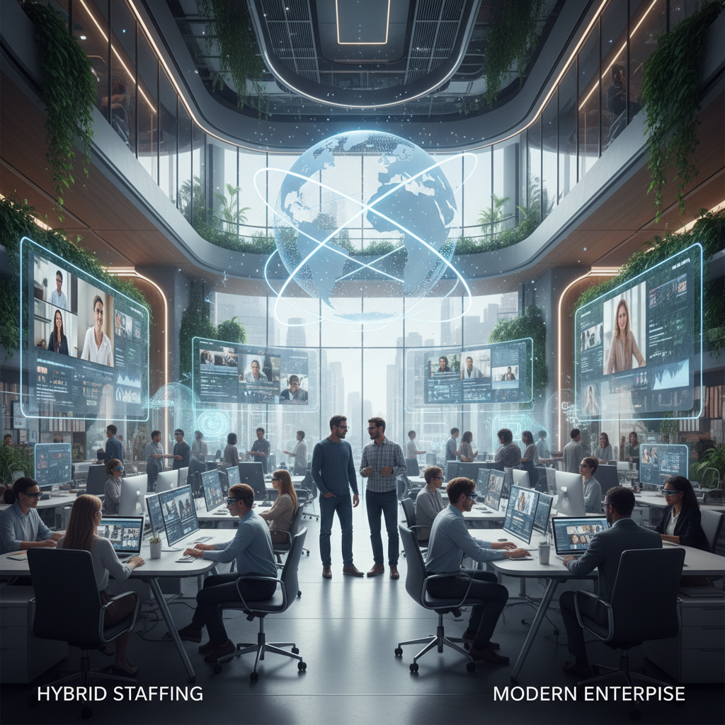 A blend of in-person, remote, full-time, part-time, and AI-augmented staff, yielding significant savings through flexibility but demanding laser-sharp workflow design.
