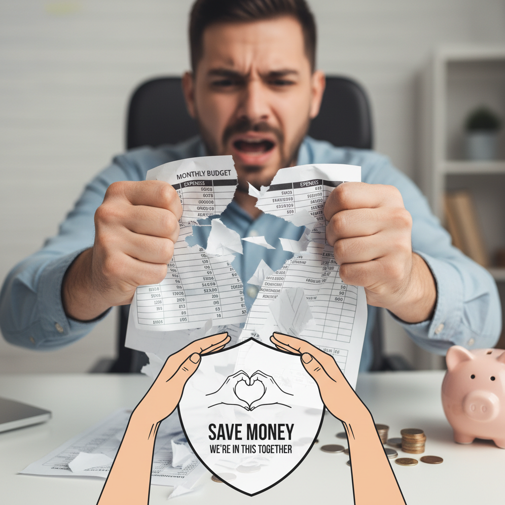 Alt text: Frustrated person struggling with save money support plans, holding a torn budget sheet, symbolizing failed money-saving attempts and behavioral challenges.