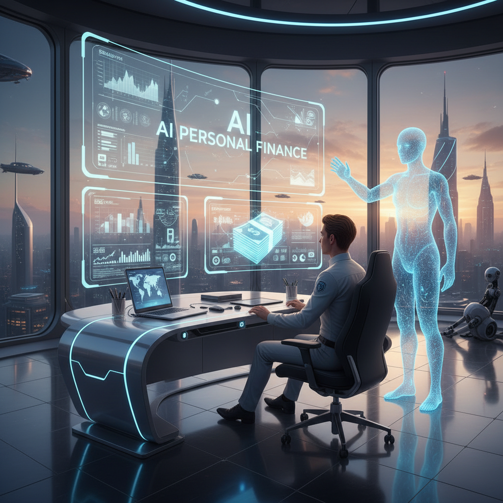 Alt text: AI assistant at a futuristic workspace reviewing personal finances, illustrating advanced save money support.