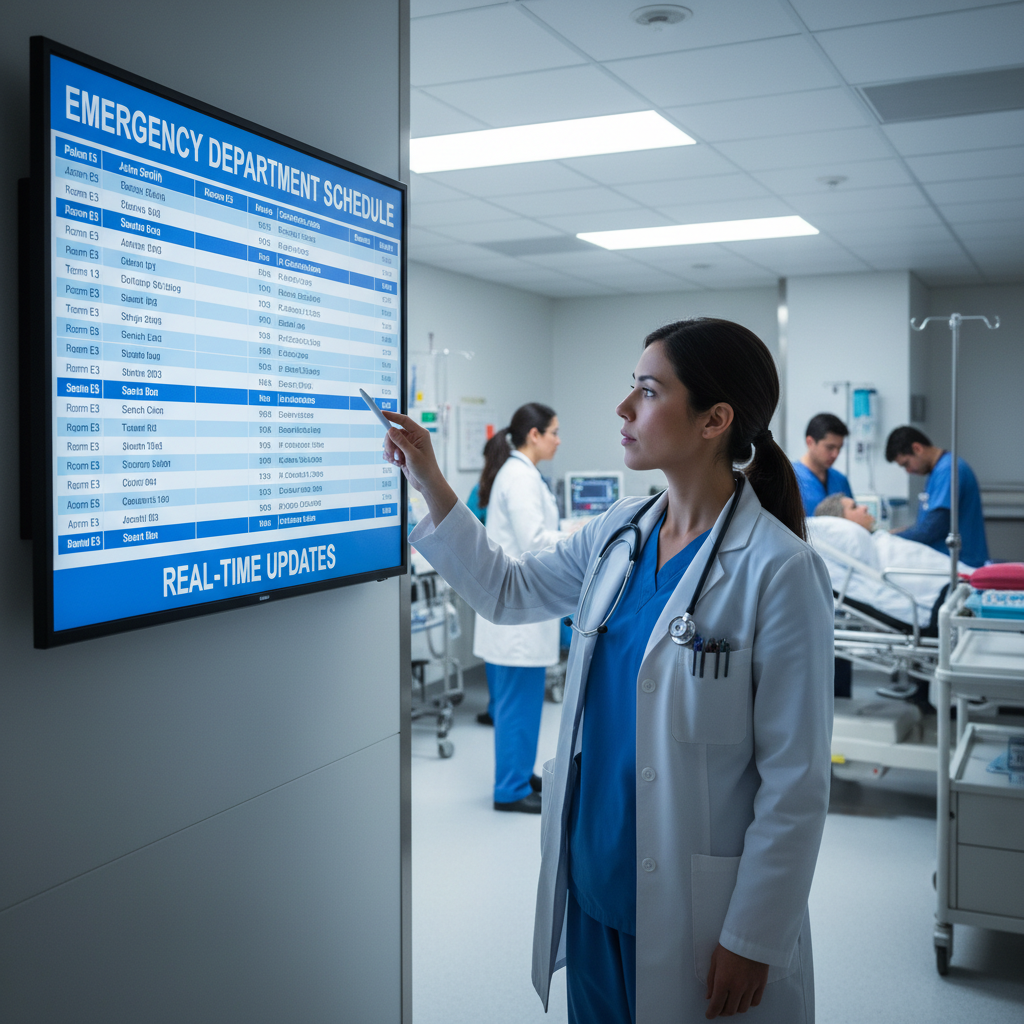 ER doctor managing emergency room schedule under pressure with digital and analog tools, showing the reality of schedule management in healthcare.