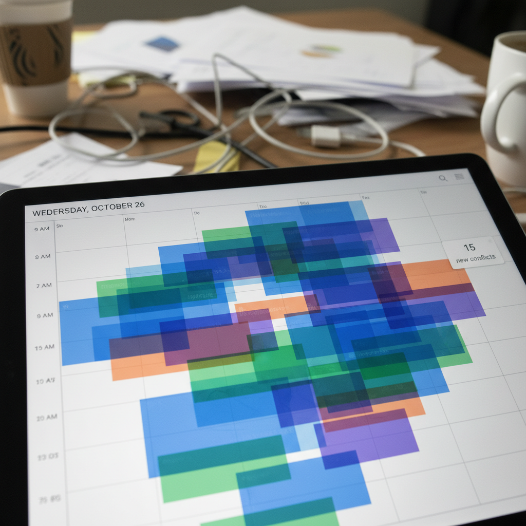 Alt: A digital calendar overwhelmed with overlapping appointments and meeting requests, illustrating workplace chaos and the need for scheduling help.