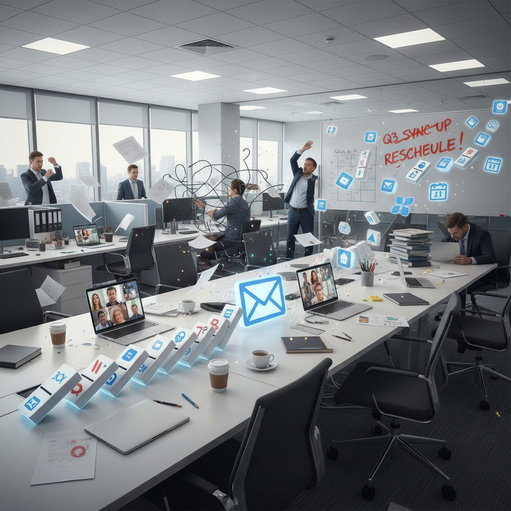 Alt: Symbolic photo of dominoes with meeting icons falling, illustrating the cascading impact of scheduling failure.